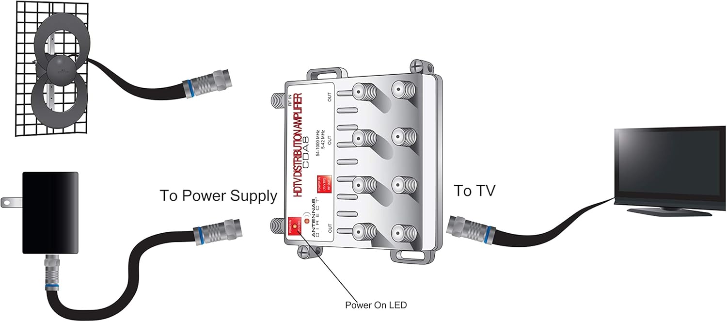 Connect one TV antenna to 8 TVs while boosting signal in each location for clear, consistent picture quality and reception.