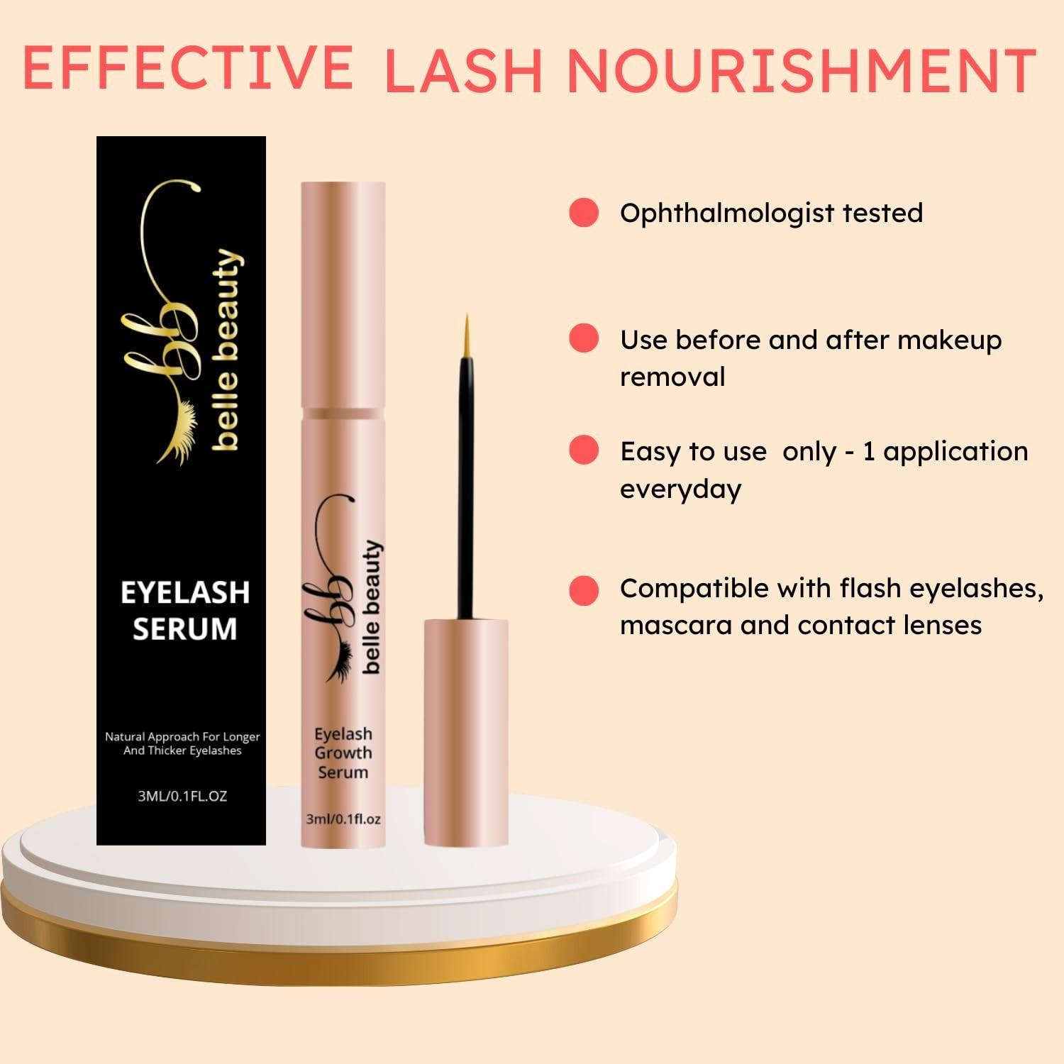 - SAY GOODBYE TO FALSE LASHES Now say goodbye to fake lashes & try our BelleBeauty eyelash booster serum. It will help you create beautiful, effortless and natural lashes which will stay with you forever.