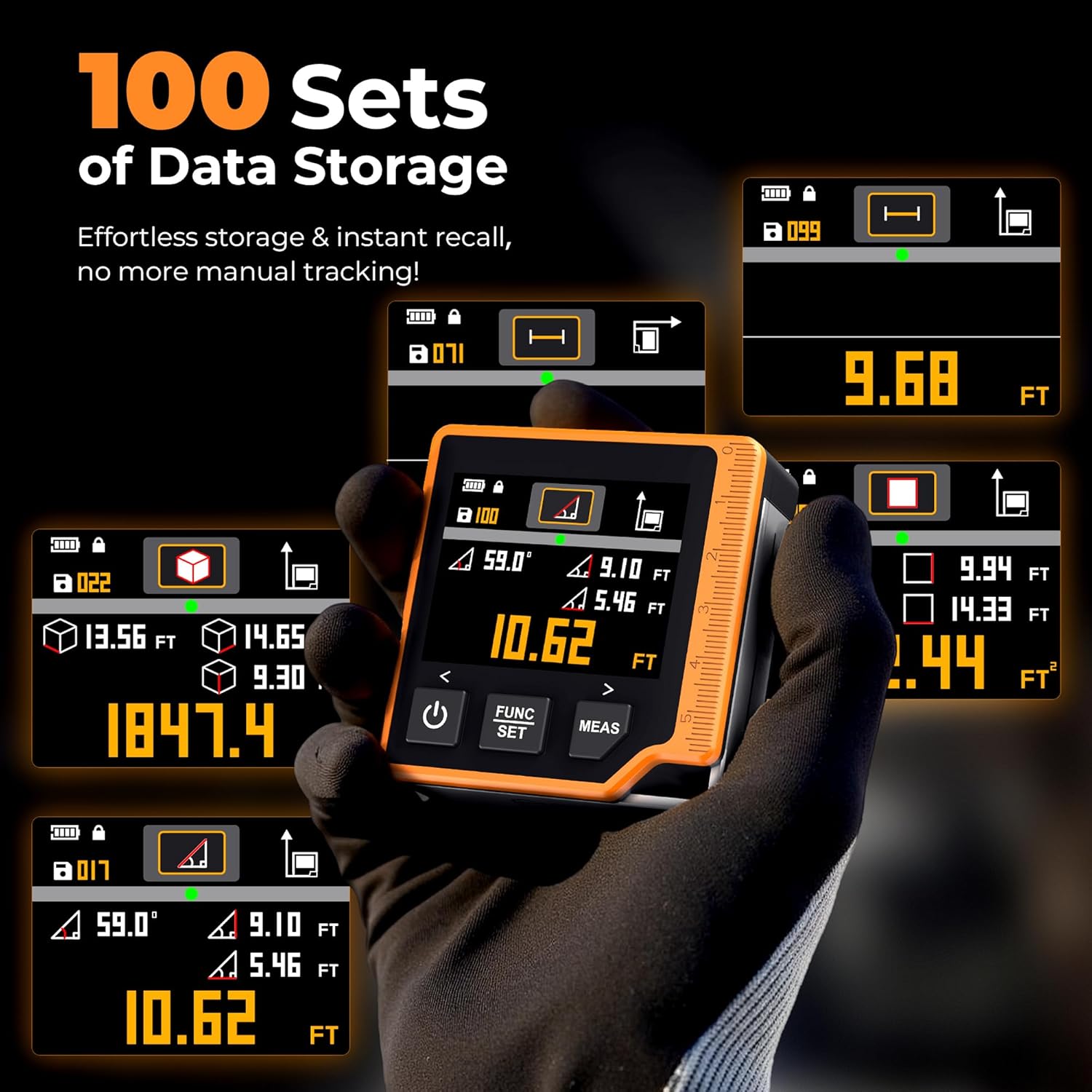 - Multiple Measurement Modes: Compared with the tape measure, the CD-80 laser distance measuring tool provides 5 modes, distance, continuous measurement, area, volume, and pythagorean measurement. It also offers two additional functions—virtual tape and 3s/5s delayed measurement. The built-in electronic angle sensor helps you quickly determine the horizontal direction. Stores up to 100 sets of data, making this laser distance meters ideal for easy review and efficient job tracking