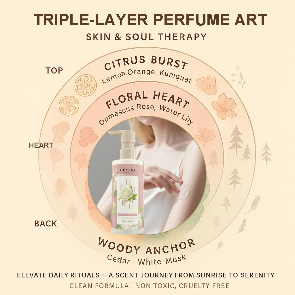 Citrus (bergamot, orange), floral (Damask rose, water lily), and woody (cedar, musk) layers create a calming, mood-boosting perfume experience. Lightweight, fast-absorbing for summer, it hydrates skin with an uplifting, elegant scent trail.