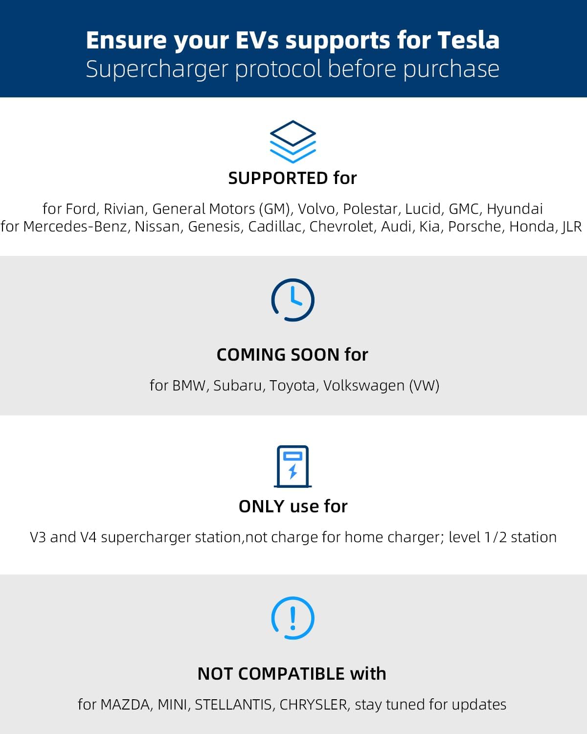 - NOTE: Verify Compatibility Before Purchase -PLEASE CONFIRM your CCS electric vehicle is compatible with the NACS (North American Charging Standard) and that your vehicle manufacturer has enabled access to the respective charging network for Tesla Supercharger Protocol(NOT compatible with Level 1 or Level 2 AC chargers)
