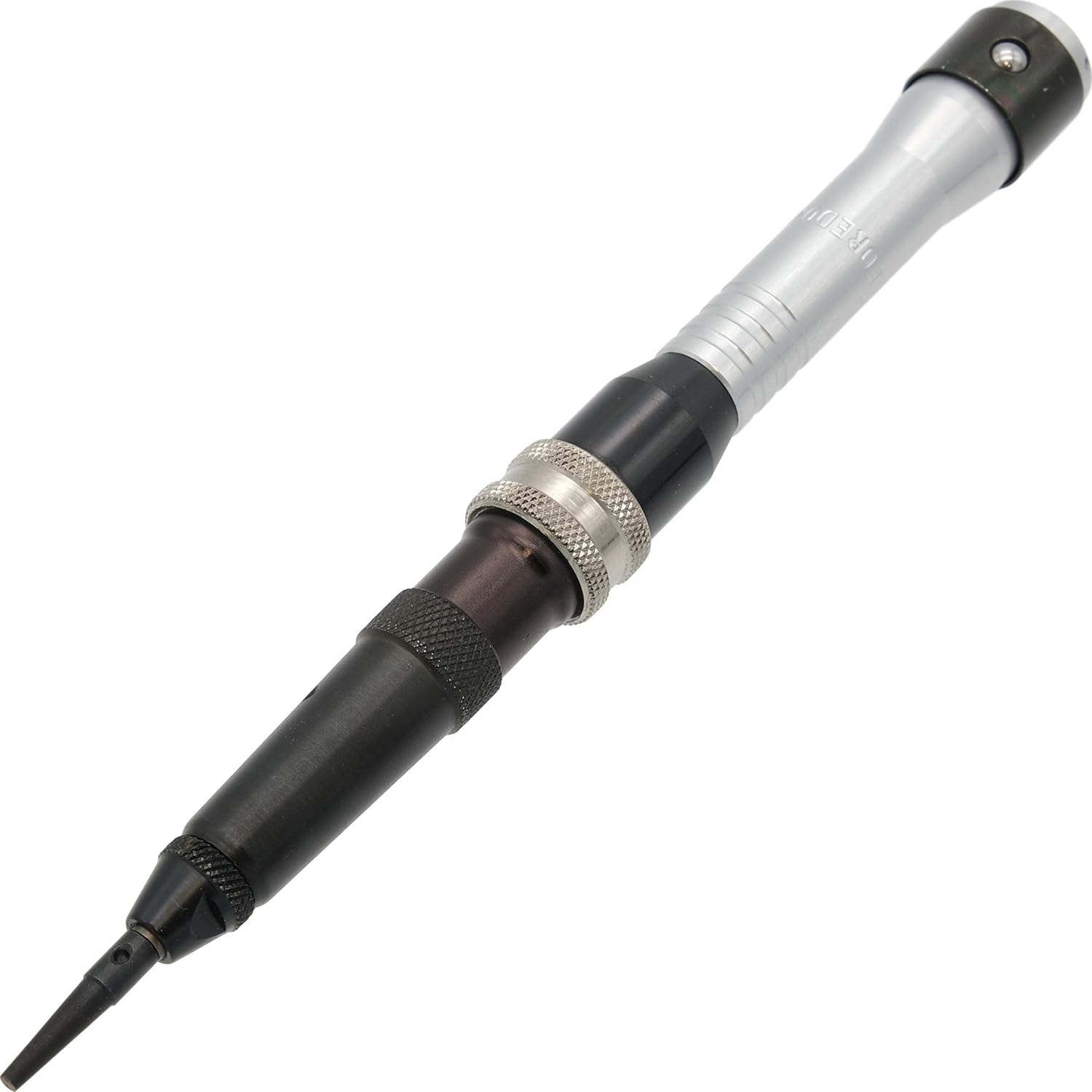 The H.15 Handpiece has hammering rather than rotary action for use at low speed (0-5,000 rpm) by jewelers for stone setting and decorative work. Comes with an anvil point (HP10177). It requires periodic lubrication. Hammer has 1/32” stroke and its impact can be adjusted from light to heavy by turning the silver knurled adjusting ring. Optional points are available: 6 different shaped Anvil Points (HP10171, HP10172, HP10173, HP10175, HP10176 and HP10179); Pave Point (R15PT), and Stylus with Carbide Tip (HP10212). 6-1/4” long, 1/4” dia. at tip, wt. 3.65 oz., ship wt. 4.85 oz. Member of the Foredom system of ”Interchangeable Handpieces”.