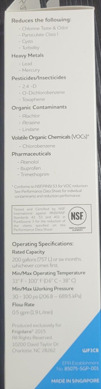 Keep safe, great tasting water flowing with PureSource 3 water filters — WF3CB reduces up to 99% of contaminants, cuts back on plastic and saves the cost of bottled water. NSF and WQA certified. Look for our berry-colored design with our new Genuine Filters seal on the package to know for certain your filter is authentic and sold by Frigidaire. Frigidaire Genuine Filters – the smarter, safer choice.