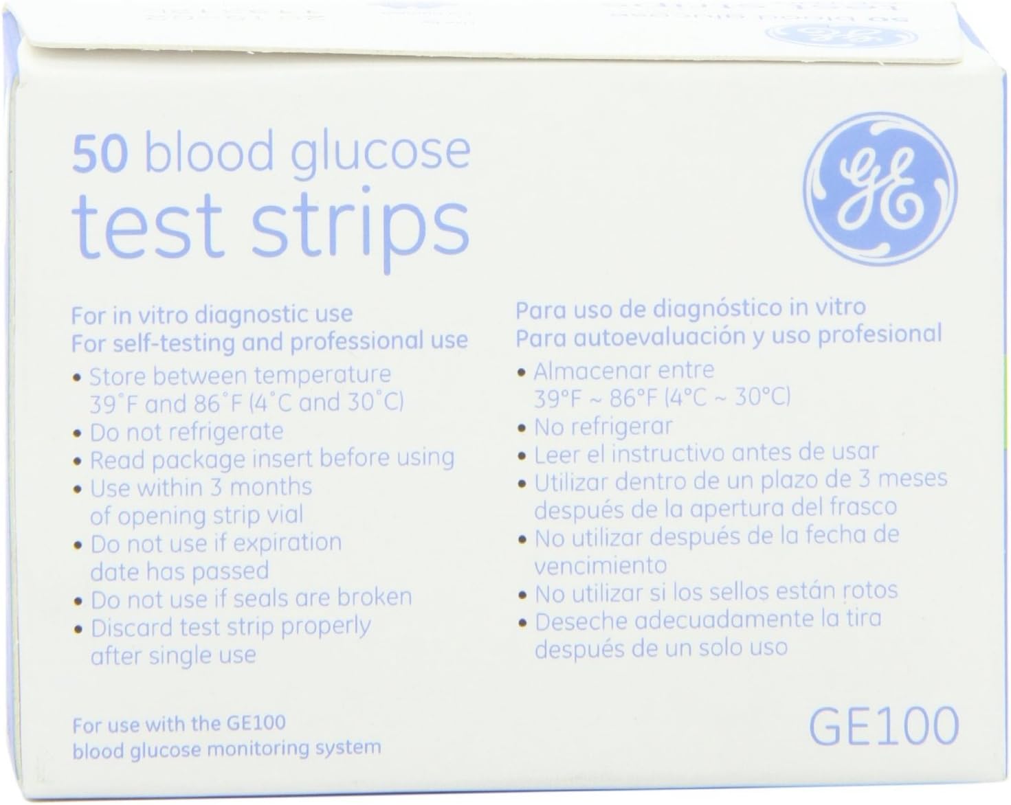 GE100 Blood Glucose Test Strips The GE100 Test Strips are designed with the needs of diabetics in mind. Using an innovative strip design, patented noble metal technology and True Auto Coding allows the GE100 Test Strips to deliver consistent, reliable, and accurate results.