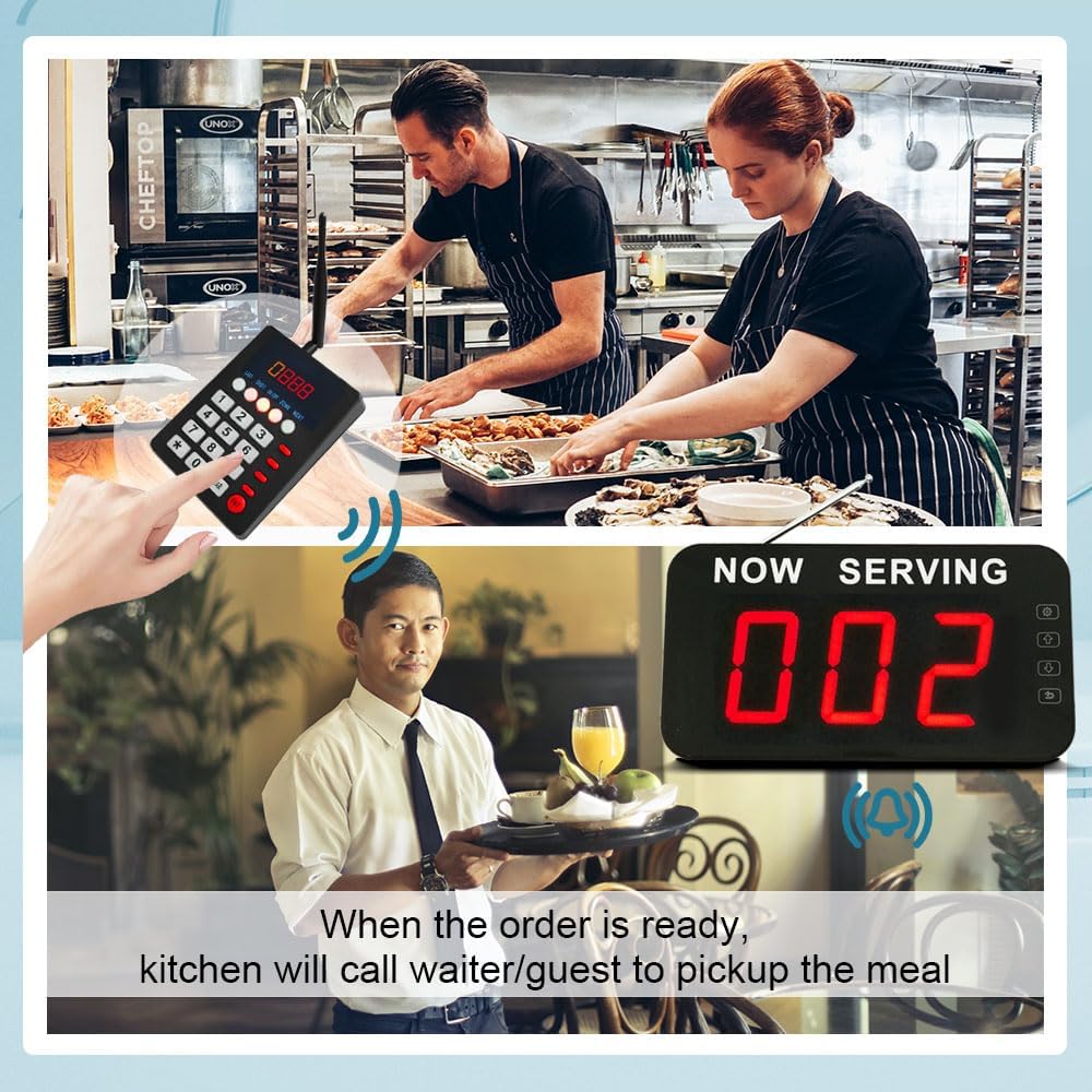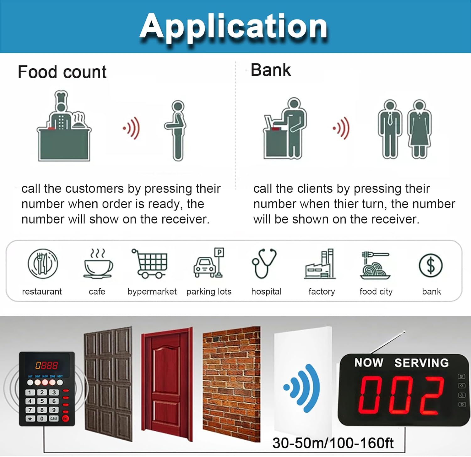 - How to work: give a numeric serial number within 999 to the customers, when order is ready, just press the number you want to call, the displays will show calling number on the screen accompanied by voice, easy to alert the customers.