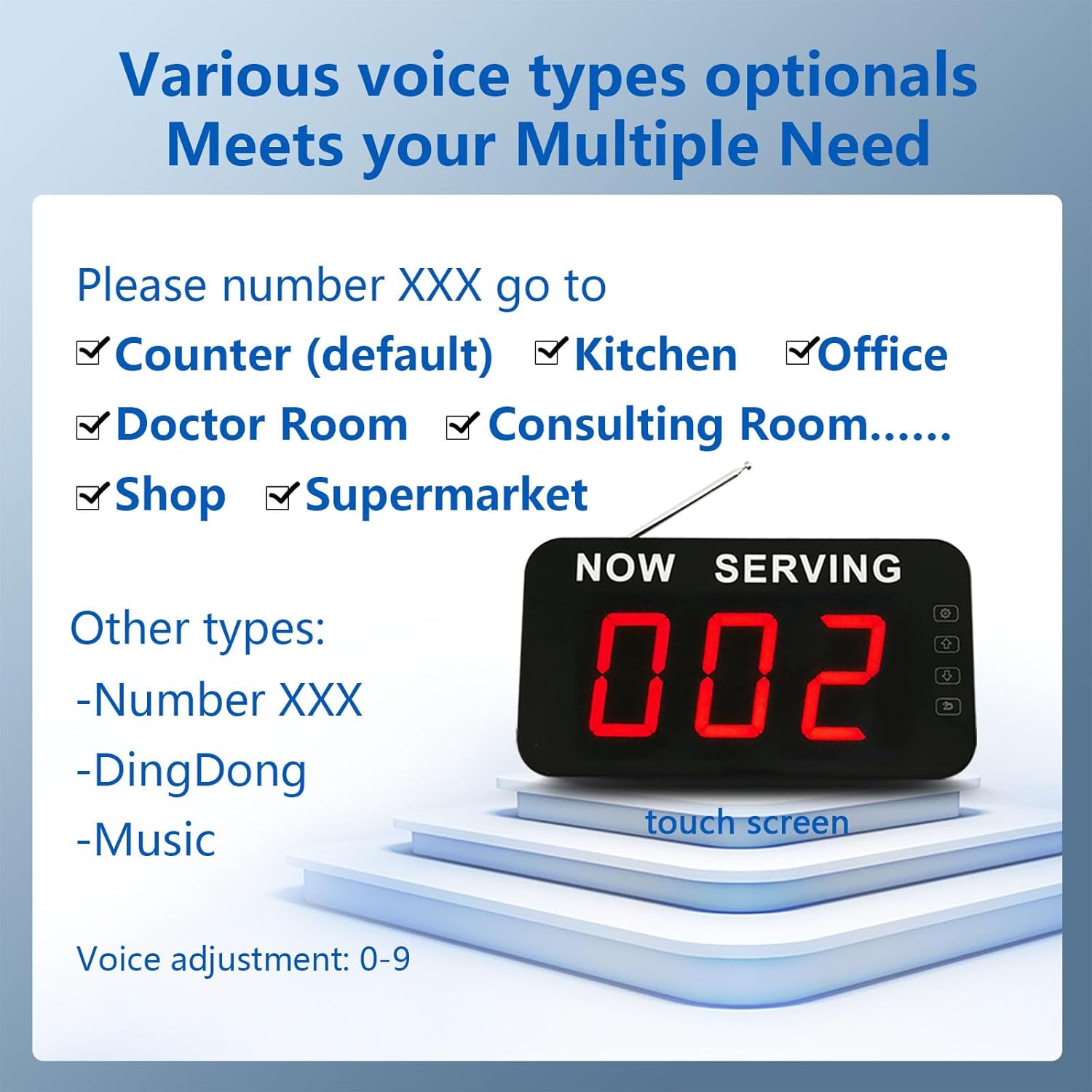 - Display: Can be wall installed or desktop style. Dingdong or English voice to prompt number change. Also can be mute if you need.