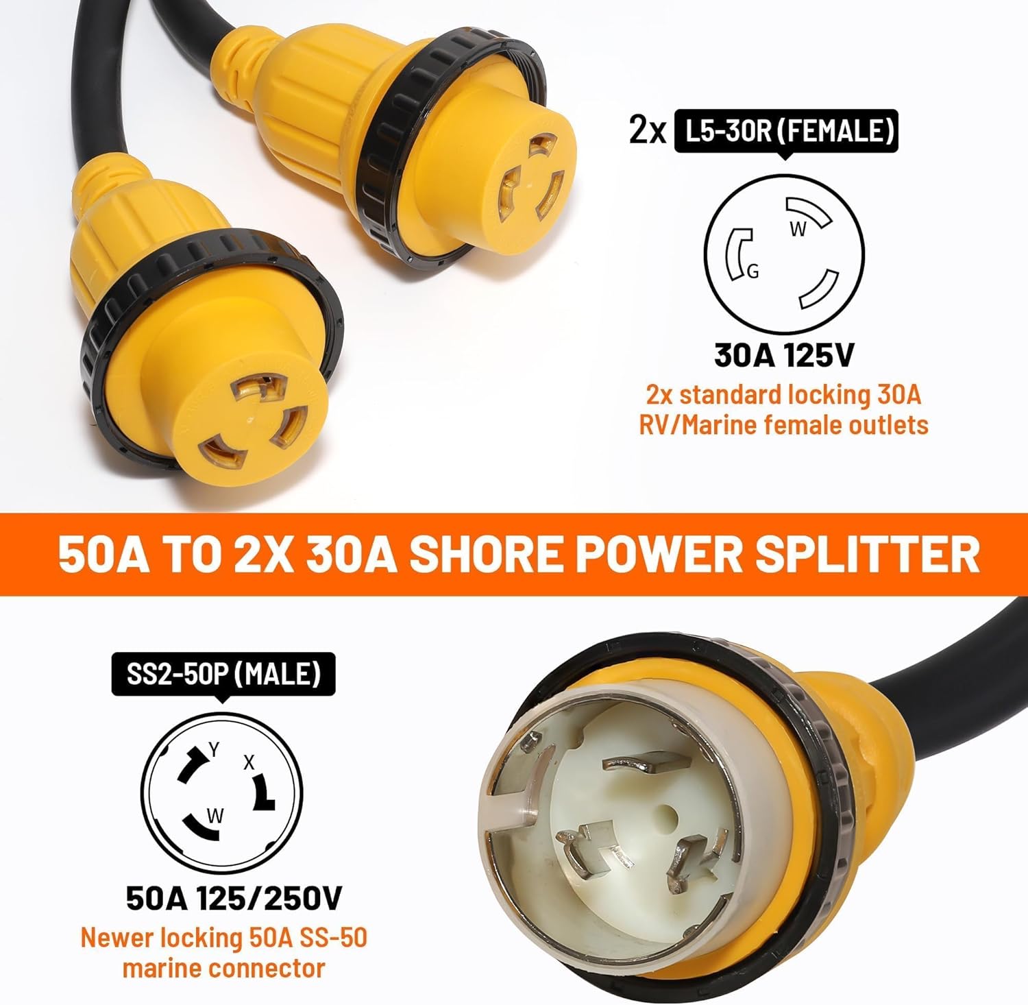 - SS2-50P to 2x L5-30R Adapter: 50 Amp 125/250V locking dock side male plug to two - 30 Amp 125V twist lock outlets; Simultaneously 30A devices (e.g., marine AC + charger) from 50A 125/250V shore power pedestal; (POWER LIMIT: 12,500W MAX!) Exceeding 12,500W total load may cause failure