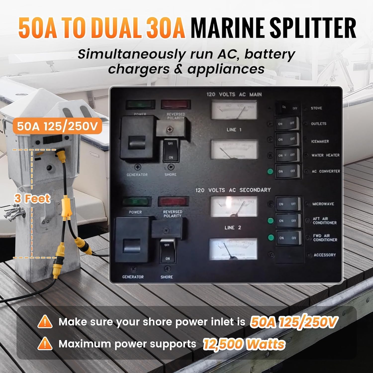- Fast Setup: Compatible with SmartYacht, Charles Marine systems, just plug SS2-50P into 50A dock and connect two L5-30R boat inlets in within 30 sec; Compact 3 feet short cord prevents tripping, fits tight marina spaces