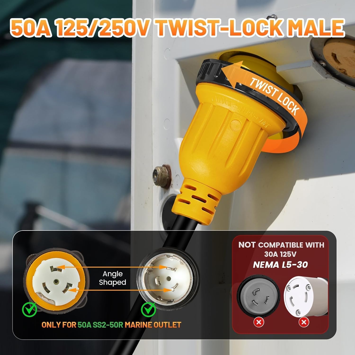 - SS2-50P (50A) Male Plug: 50 Amp Marine Shore Power twist lock SS2-50P/CS6365 plug with locking ring, 125/250 Volt; unlock dual 30A power from your 50A dock outlet (*Confirm your dock type before purchase)
