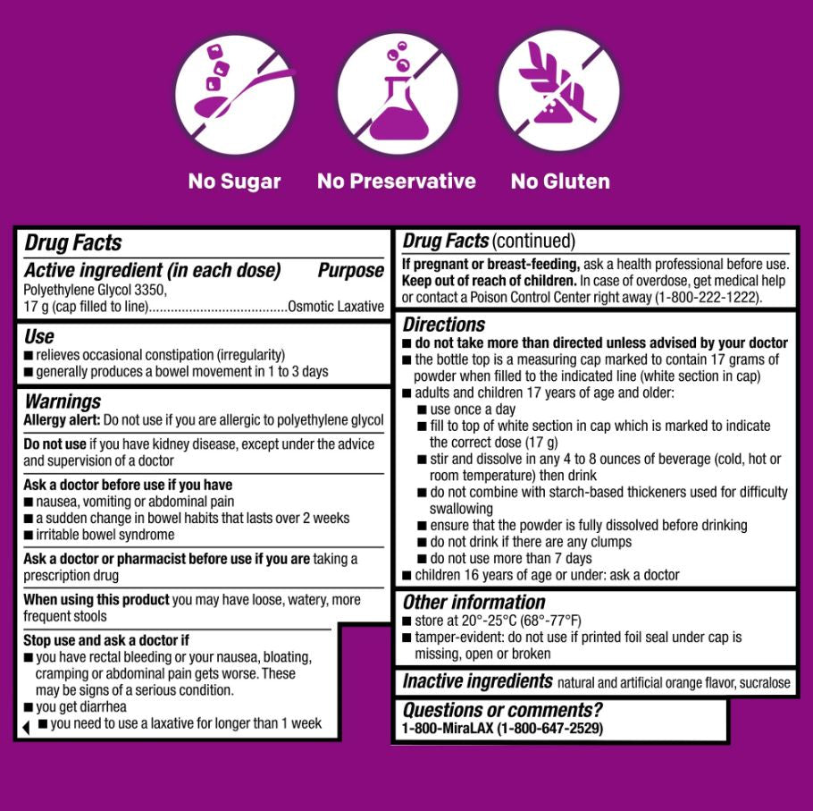 - Free From: MiraLAX is gluten-free, sugar-free, preservative-free and dye-free