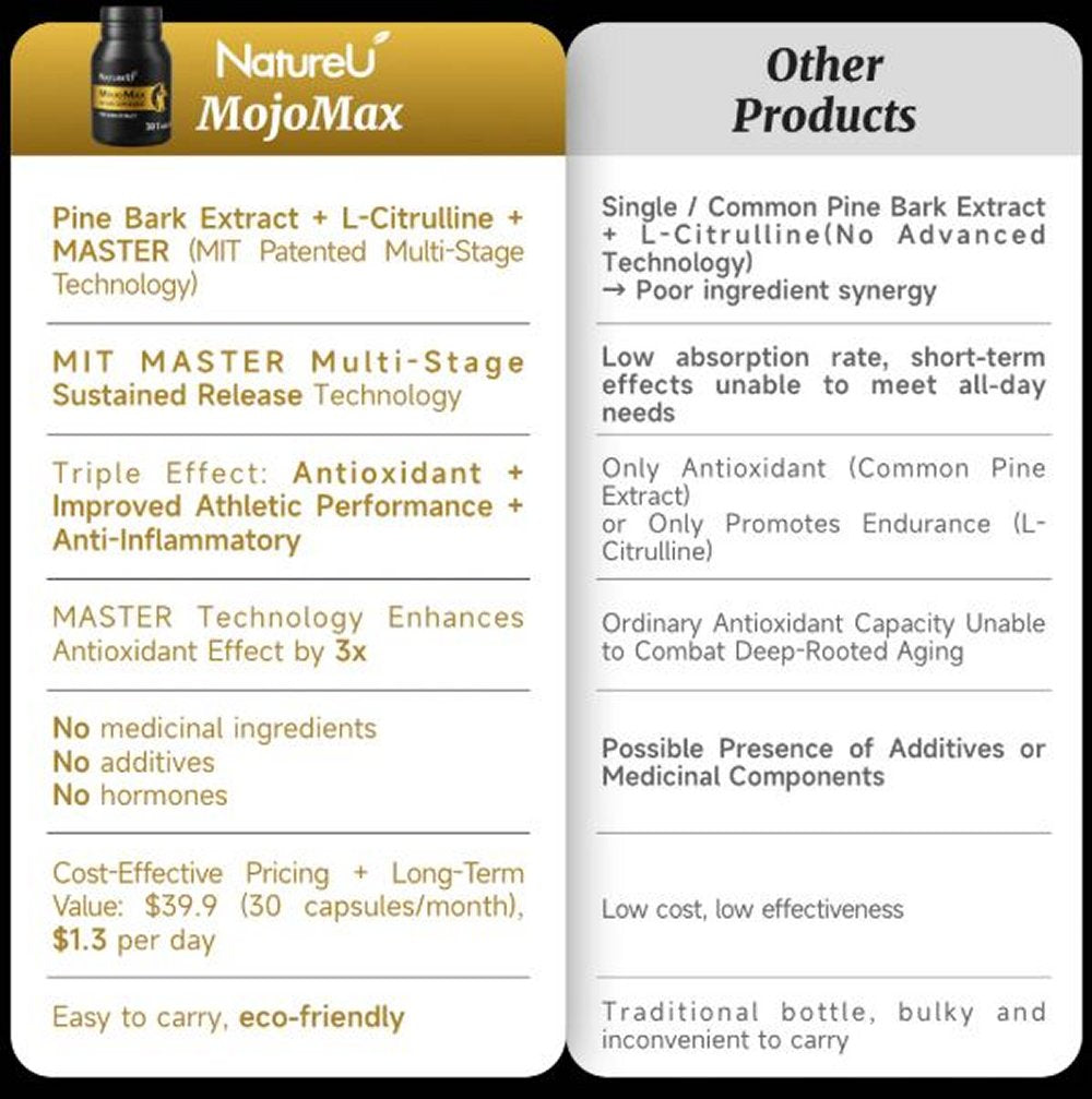 Rejuvenate your body and mind with NatureU MojoMax Energy Supplement. Incorporate this transformative supplement into your daily wellness routine and experience new levels of male performance and energy. Confirmed by clinical research, it can effectively improve men's physical function and charm, add joy to life, and delay aging.