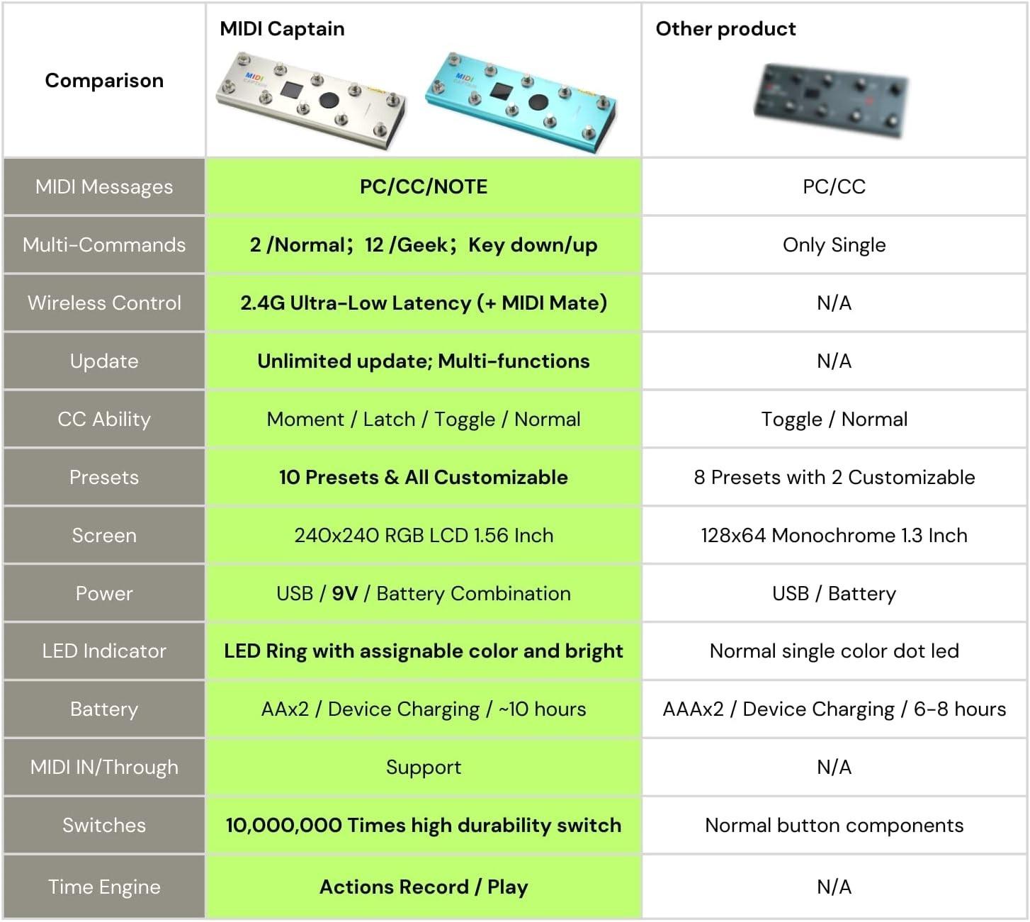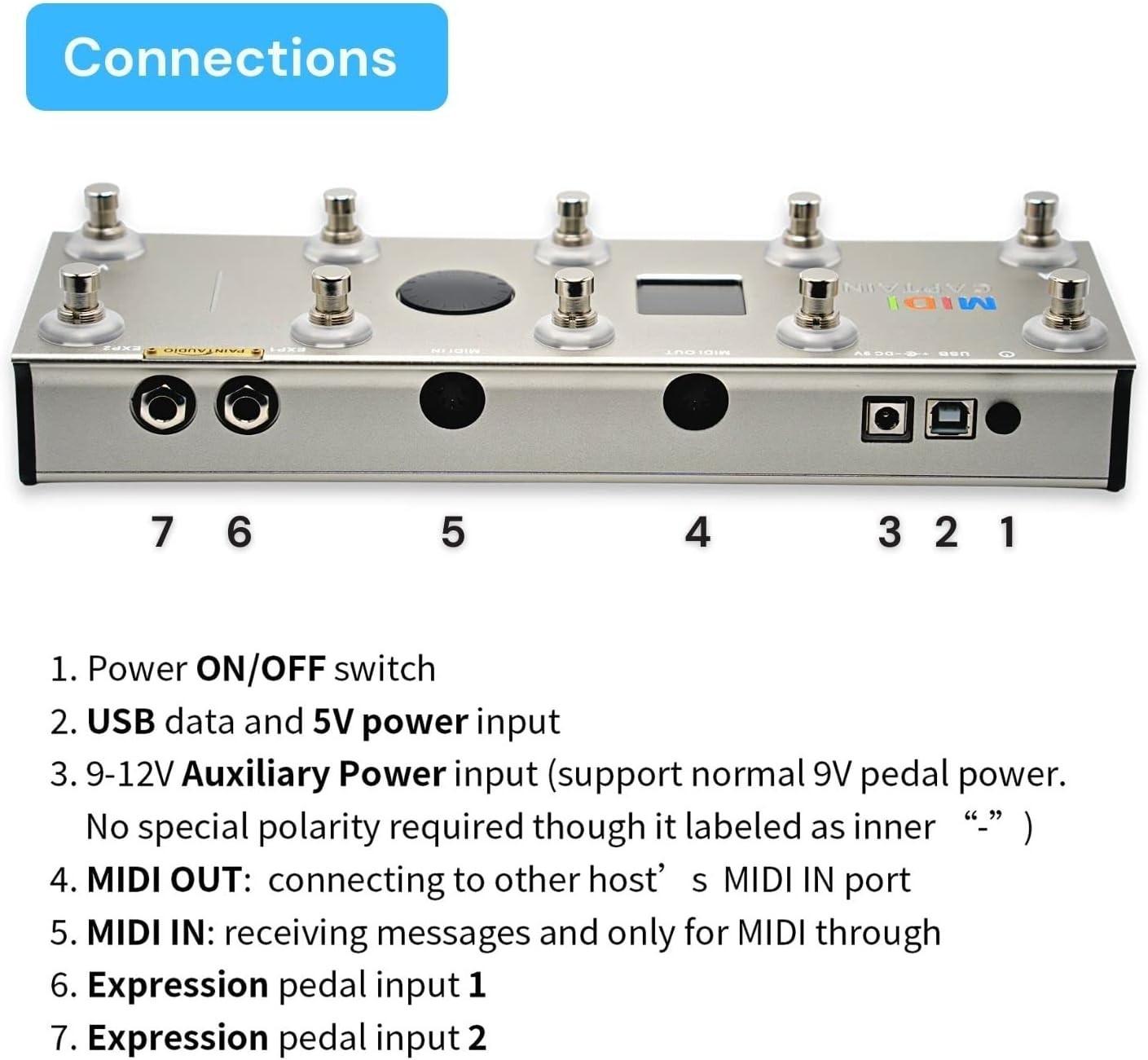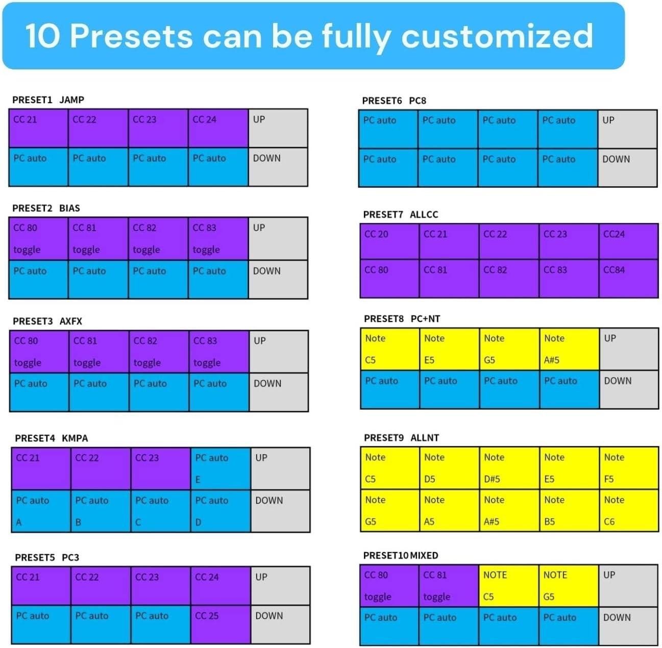 - 10 Foot Switches: The Latest MIDI CAPTAIN supports all PC/CC/Note midi messages; and control desktop/Rack effects/Pedals/Keyboards/Synthesizers; Functions of the 10 switches all can be fully customized; The keys also support separated push and release functions