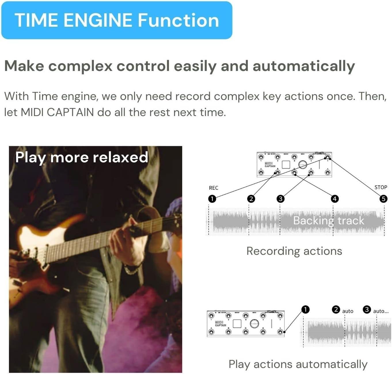 - Original Time Engine Function: The unique time engine design creatively achieved automatic control of complex key actions in playing; Prepare all the needed effects presets in one bank; recording the actions for once -and MIDI CAPTAIN do all the next time; Enjoy your music gigs in a much easier and relax way