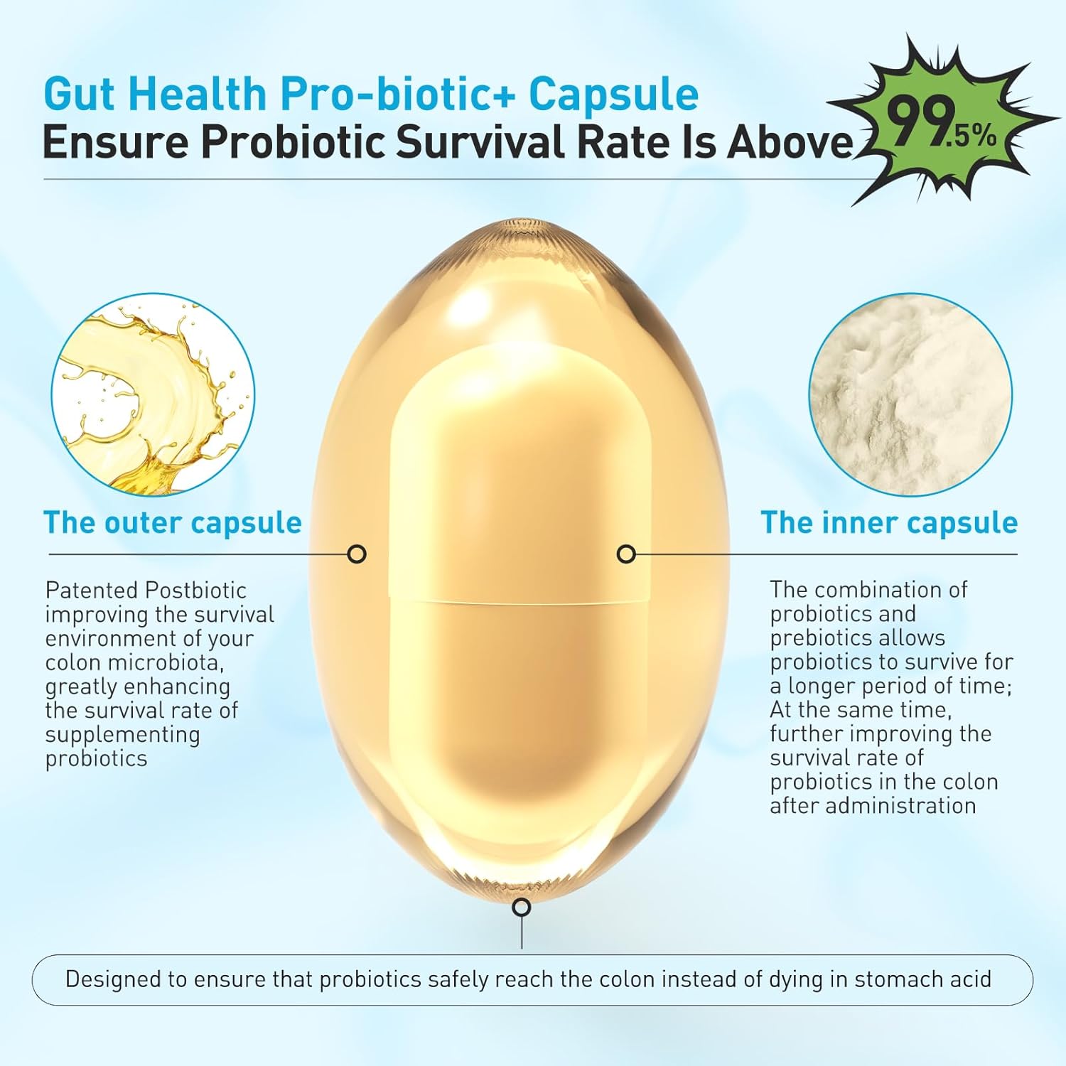- Leading Capsule Design: Our innovative nested capsules use delayed release technology to help probiotics reach the colon (not the stomach), making it an ideal place for probiotics to survive and grow. After reaching the colon,Postbiotic ingredients can improve the intestinal environment and promote the survival of probiotics. All of these use moisturizing techniques to protect probiotic strains, ensuring a probiotic survival rate of 99.5%