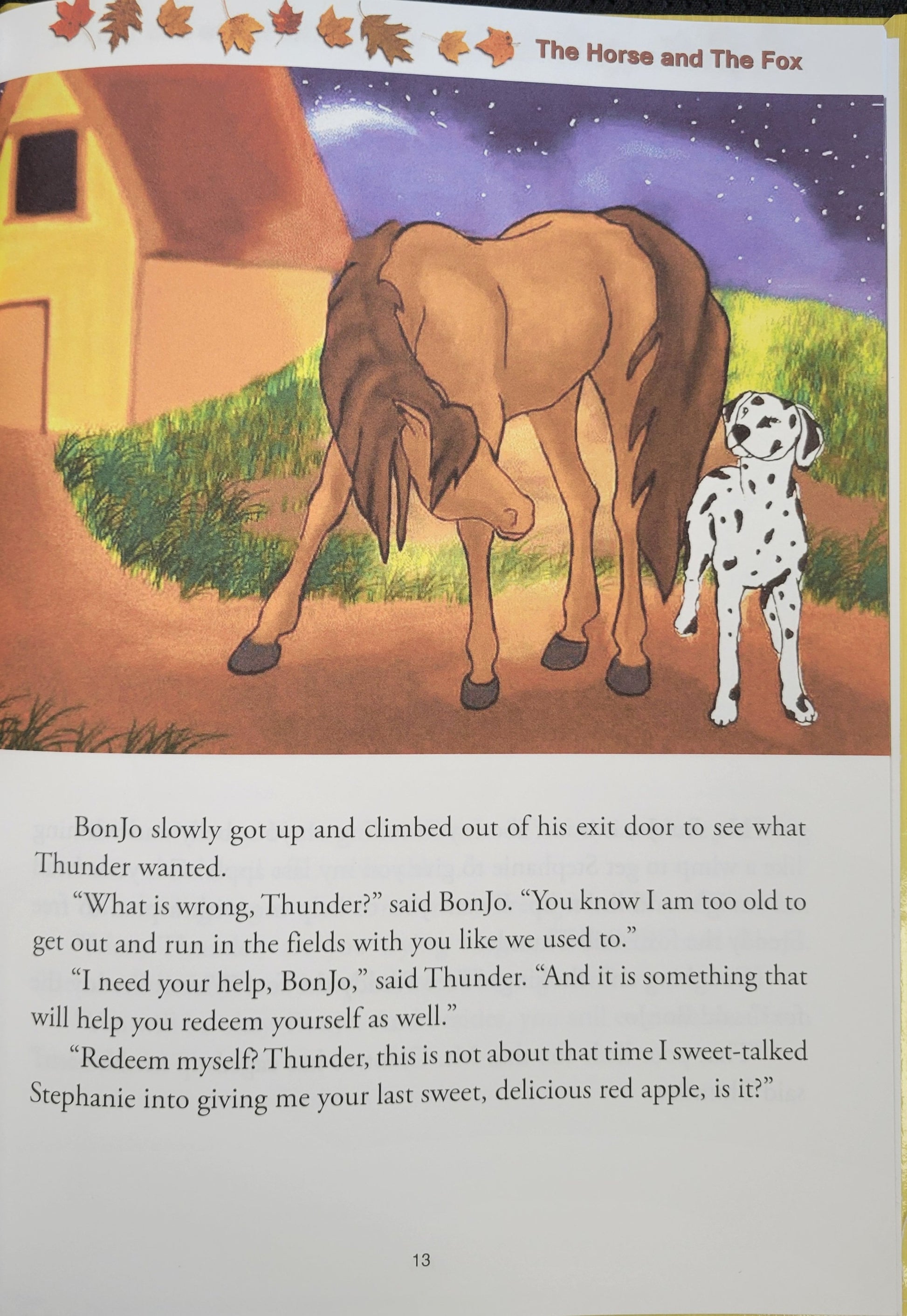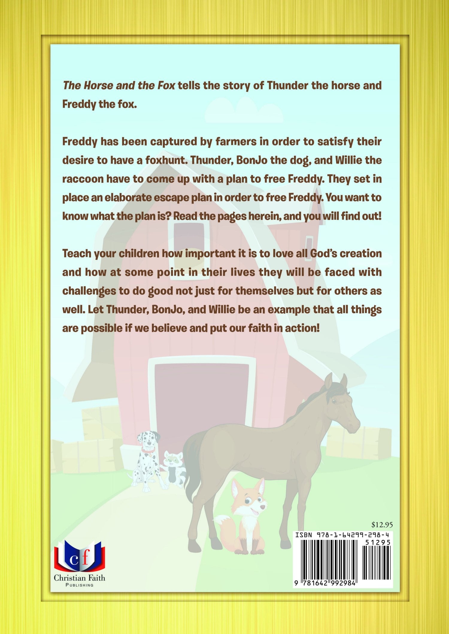 The Horse and The Fox is a book that tells the story of Thunder the horse and Freddy the fox. Freddy has been captured by farmers in order to satisfy their desire to have a foxhunt. Thunder, Bonjo the dog, and Willie the racoon have to come up with a plan to free Freddy. They set in place an elaborate escape plan in order to free Freddy. You want to know what the plan is? Read the pages herein and you will find out!